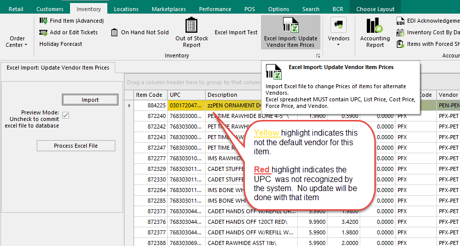 Import your file into the Excel Import: Update Vendor Prices screen. The initial import will give you a preview. Once you are happy with the file, uncheck "Preview Mode", click Process Excel File and the price changes will be committed.