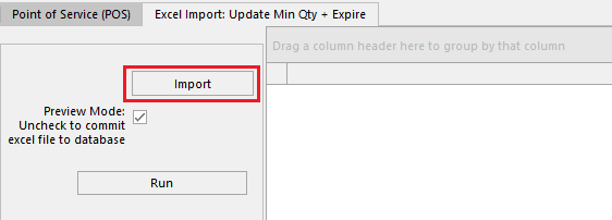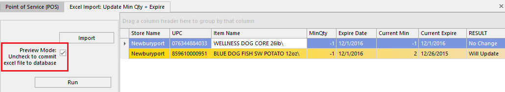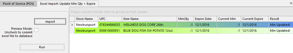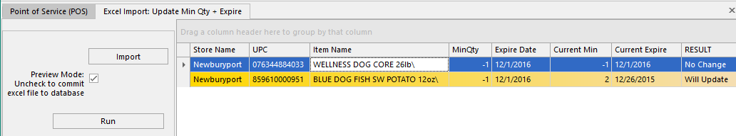 After your Excel file loads the screen will display the items an associated information from your loaded spreadsheet. Rows will be colored according to whether or not the min QTY already in the system matches the one in your spreadsheet. Yellow rows indicate a different value while white rows indicated the same value. There is also a column called "Result" that describes this.