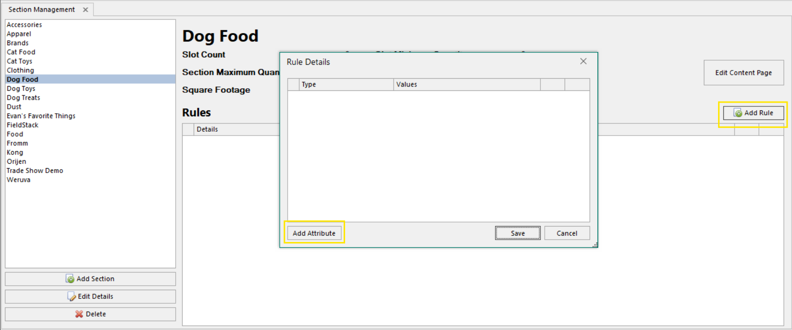 A section is a rule-based grouping of items used to populate web store pages. Sections filter items by their attribute values. For example, a section could include all items with the attribute "Pet Type: Dog" and "Flavor: Chicken." You must create a section before building a category page that uses it.