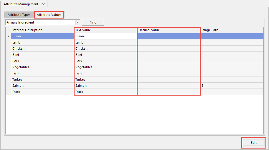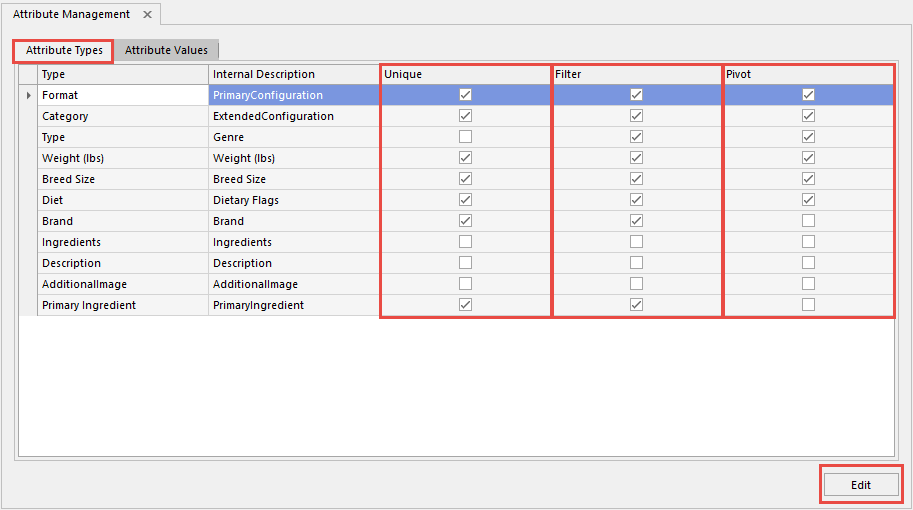 To edit attribute values, select the 'Attribute Values' tab, and an "Attribute Type" in the drop down menu.