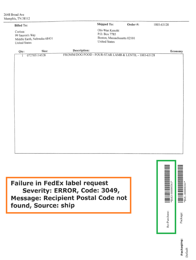 You can see an example of a failed postage label below. Notice the failure message highlighted in orange, and the Re-Purchase barcode highlighted in green:
