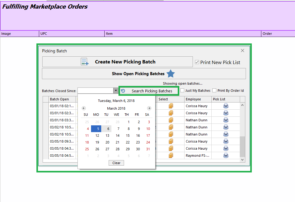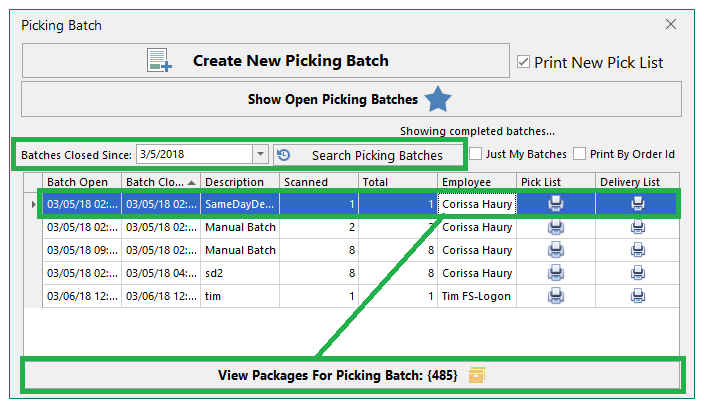 This window will open up. Here you will want to choose a date range for the Batches Closed Since field, and then click "Search Picking Batches".