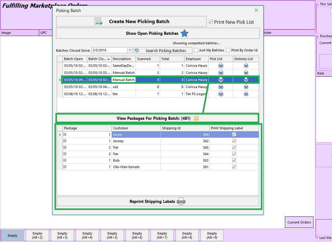 Above we are looking at a manually generated batch from March 5, 2018. We can see that in this batch there were six packages for five customers. Any one of these packages can have its shipping label reprinted from this screen. In the example above, all six labels would reprint because the checkboxes in the far right right column under Print Shipping Label are all checked. Simply un-check the labels you do not need to reprint.