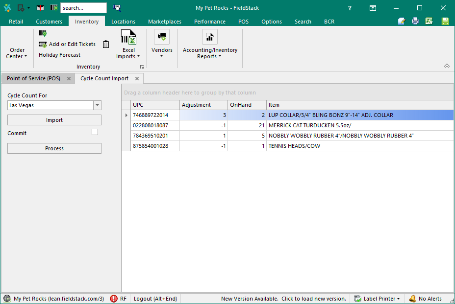 The Cycle Count Import button can be found on the Inventory tab in the Inventory\Excel Imports section: