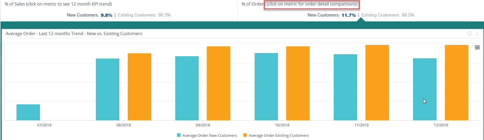 At the top of the dashboard, a selection of KPIs reflect overall sales and orders, for new and for existing customers. Additional KPIs reflect the percentage of new customer vs. existing customer sales and orders for the selected date range - note that these additional KPIs allow you to click on the metric for a drop-down view of details and graphics. The customer account creation date defines whether a customer is new or existing in each month. A useful application of this section is to monitor the KPIs for expectations and growth, particularly when you deploy initiatives to gain new customers. You will be able to see the trends of customer acquisitions, as well as percentages in sales, # of orders, average orders and items per order - and compare them with the rates for existing customers. Naturally, once customers move from new to existing status, you will be able to see the impact in the following month KPIs. You might find that new customers consistently over or under spend your existing customer base, and be able to take marketing or other steps to close the gaps. You also might establish goals for customer activity, and be able to monitor and intervene based on the KPIs.