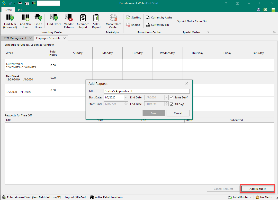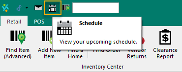 Employees may request time off by selecting the Schedule button in the toolbar.