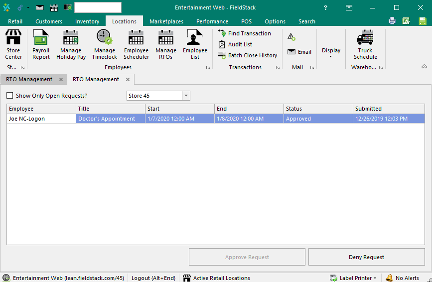 Managers can then approve or deny requests by clicking on the Locations tab, and selecting Manage RTOs
