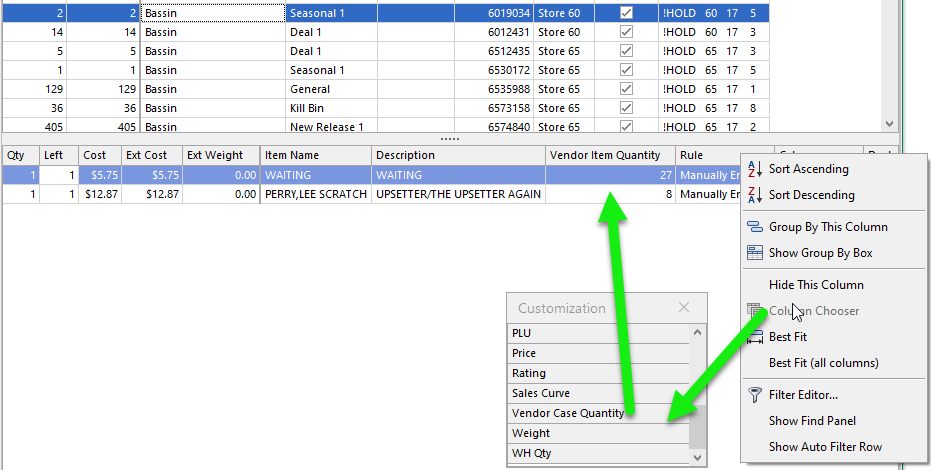 - Vendor On-hand value now available on Order screen for vendors supplying on-hand feeds. Right-click on order items grid ->Column Chooser. Drag Vendor Item Quantity onto the grid. Available on both Find Order and Order Listing screens.