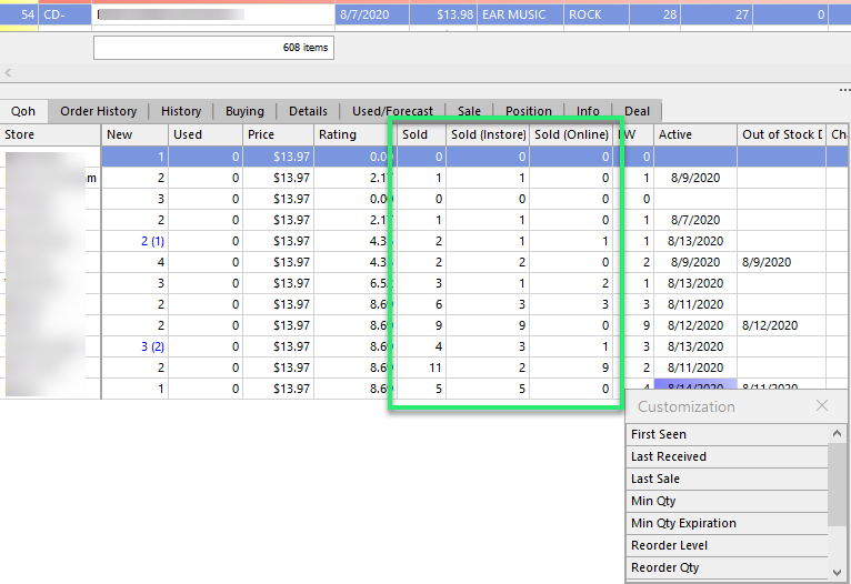 - On the QOH tab, sold now represents the total of in store sales and online sales for that location. There are two hidden columns in column chooser that break out in store and online sales.
