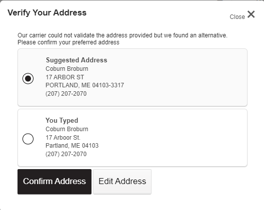 - Improved the shipping validation section at checkout to display the entered address for the order instead of a customer's saved address. The additional validation screen is blocked by a setting and can be activated/deactivated by request.