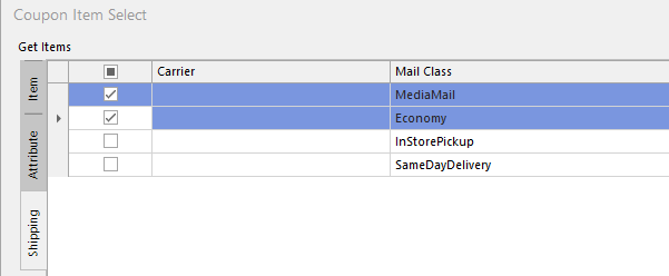 Add Get items and choose the applicable shipping methods, delivery surcharge attribute, and state attribute. The coupon will apply to orders with the chosen shipping methods in that state.