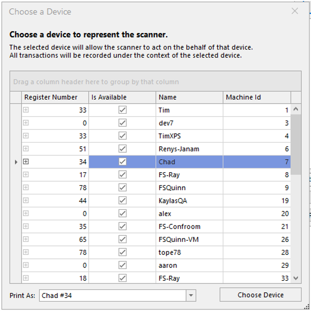 Select the device you are representing. This could be a POS computer, but in a location with many handheld devices, choose the device itself from the list.