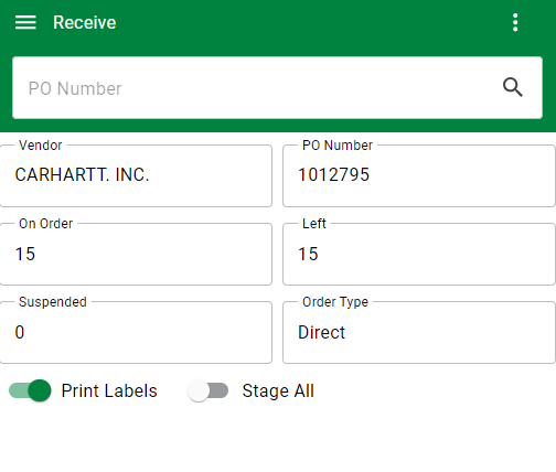 8. Tap Finish PO to complete receiving and return to the primary Receive screen.