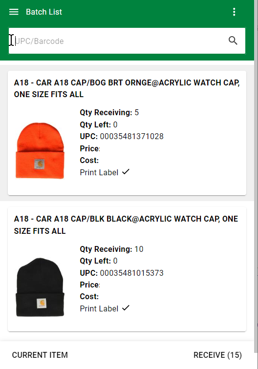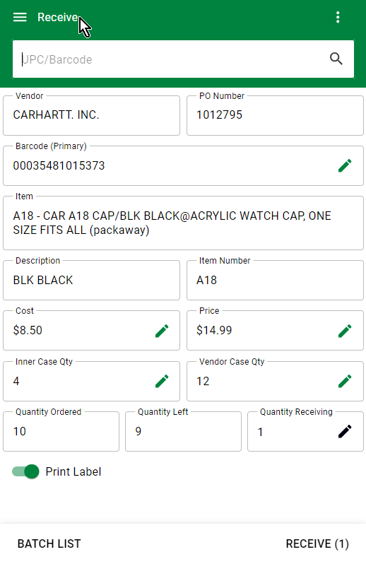 This will move you to the next screen. Your first item will not be received but it and each subsequent item will move to the batch list which can be received all at once, suspended, or cleared in full. This allows items be scanned in succession and reviewed before committing. It also allows eaches to be scanned one after another without any screen interface until all scanning is completed.