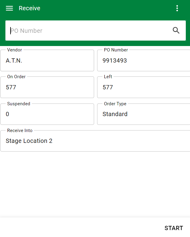 2. Enter a PO number or select your PO/reason from the Open POs list to begin receiving to an order.