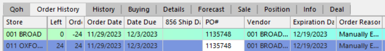 The transfer purchase order now exists with your store showing the sends with zero left and the destination store showing that they are expecting that same amount. When the destination store receives the product, the order line for that store will update and the order should balance to have zero left.