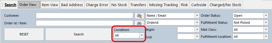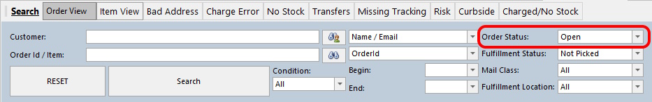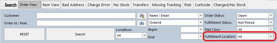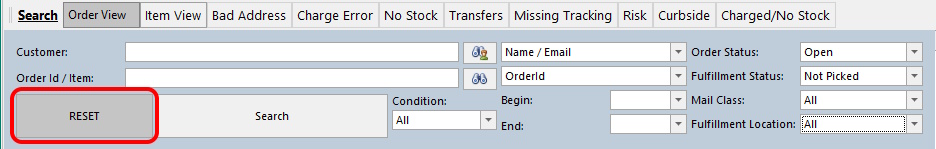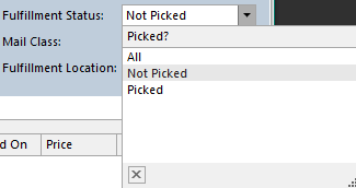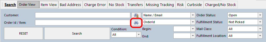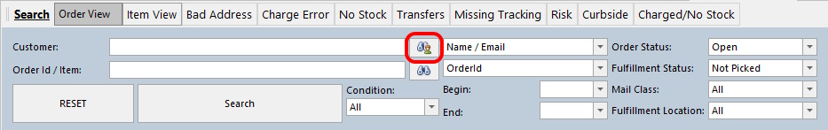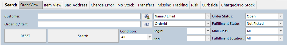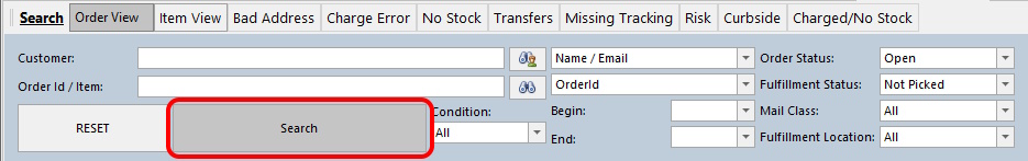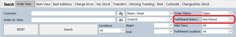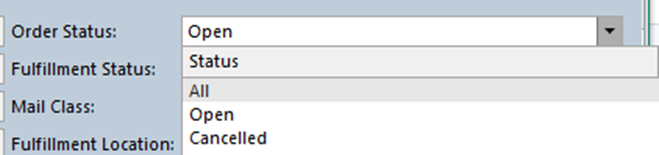 Fulfillment Status: You can use this dropdown to narrow down the search results to orders that have already been picked and scanned in, or orders that haven’t been picked or scanned in yet. In other words, you can choose to look at orders that have already started the fulfillment process or those that have not. ![]()