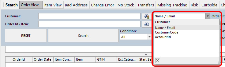 Customer: You can use this to search for a specific customer’s orders. There’s a couple of different ways you can search for a customer: