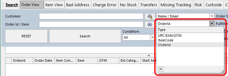 Order Id/Item: You can use this to search for a specific order using its Order Id, or for orders containing a specific item. Depending on what you’re searching for, there are a couple of different ways to search using this field: