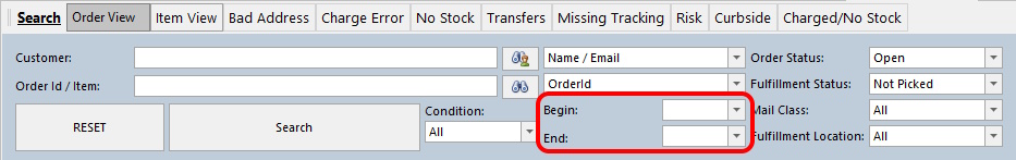 Begin & End: You can use these date selectors to narrow down the search results to only orders placed within a specific timeframe. ![]() |
