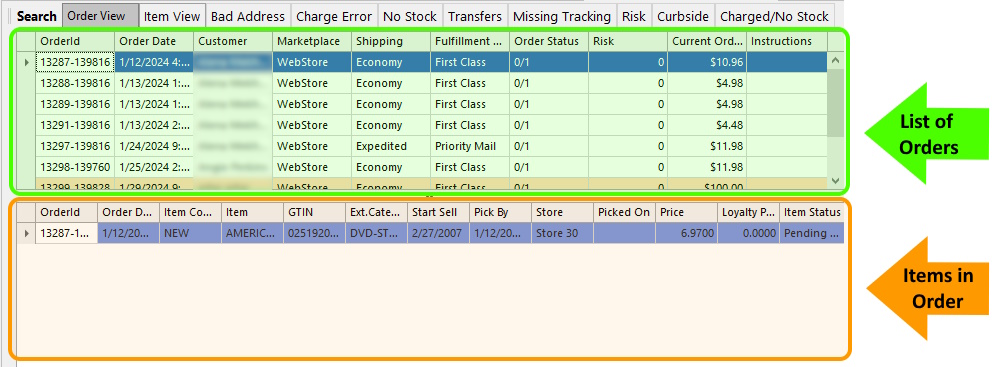 - List of Orders: found in this view’s top pane, this list shows orders that match your search criteria.