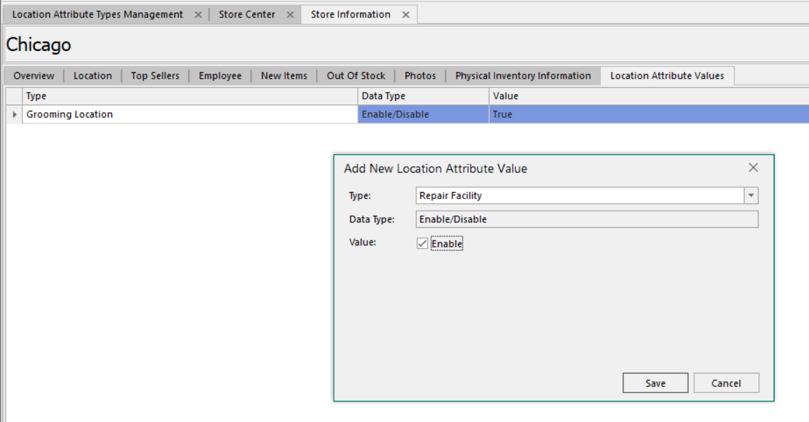 On the store center tab, within each location’s information, a tab called Location Attribute Values allows user to add attributes to a specific location. From here Numeric allows the entry of numbers with decimals if needed. Enable/Disable can be checked or unchecked.