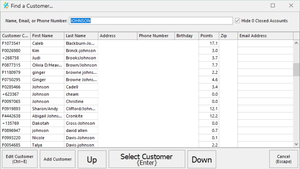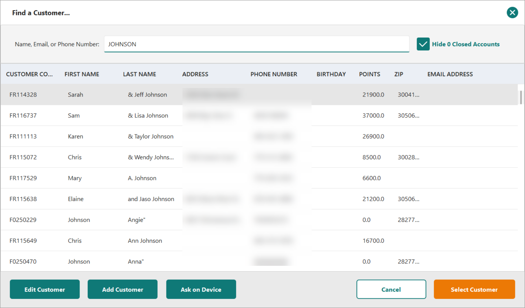 In the customer Find a Customer window, you can use the Edit Customer button to edit the account details, or you can press the Select Customer button or Enter key to associate the customer with the current transaction in the POS.