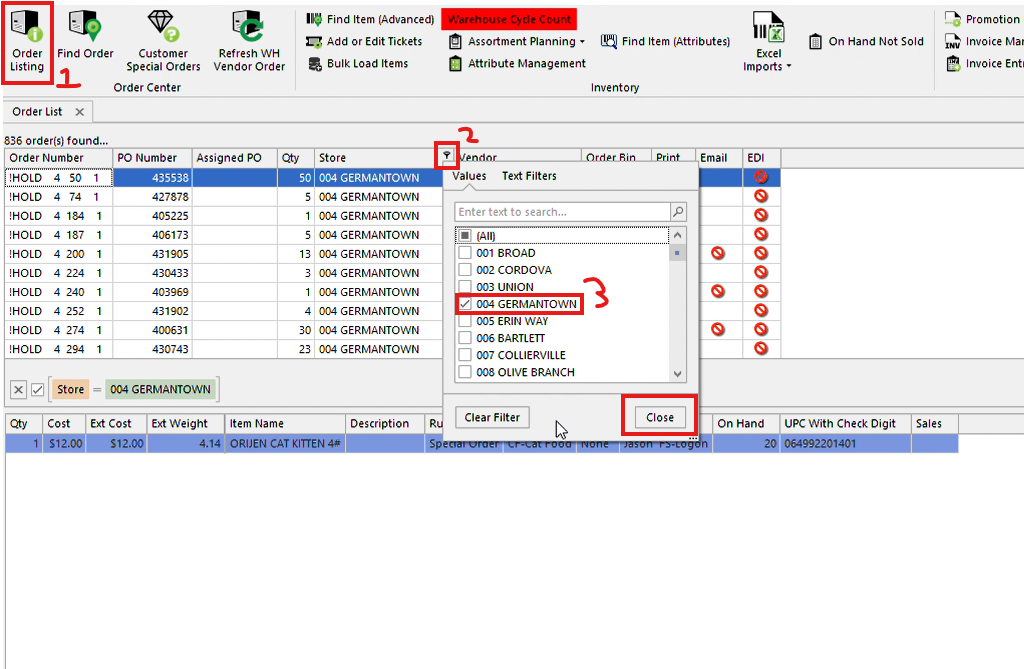 3. Select the store you want to see the orders for and close the window. After doing so you should only see orders that are on hold for that store.