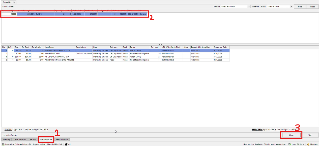 Closing active ordersAfter zeroing out the hold orders active orders can be cancelled by doing the following: