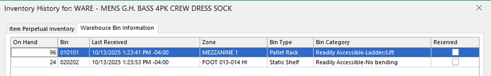 Perpetual Inventory tab now shows detailed bin information including zone, type, category, and reserved status. The date/time was altered to show your local time instead of UTC time.
