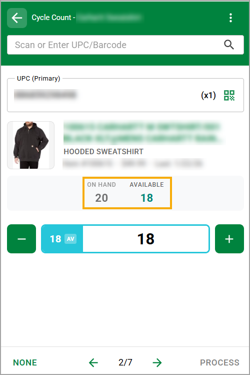 If setting, "Inventory Adjustment Updates on Hand Available" is set to True, FieldStack Mobile will display the On Hand Quantity and Available Quantity. The Cycle Count will be specific to the Available Quantity. This alters Cycle Count to ignore Holds, Special Orders and open Marketplace Orders while counting and updating.