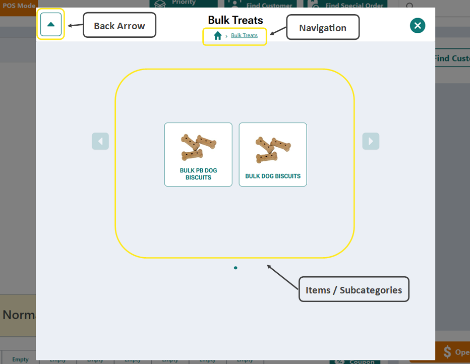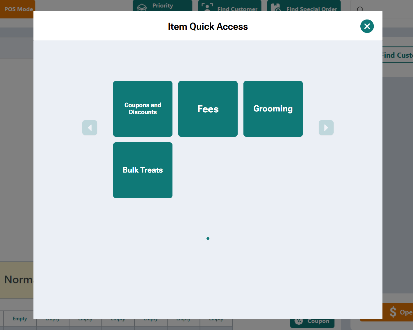 Quick Access is a touchscreen menu on the POS that lets users add items to a sale without scanning a barcode. Your administrator sets up the menu with items like large or heavy products that are difficult to scan, items without barcodes, coupons, or common fees such as bag fees all organized into categories for easy access.