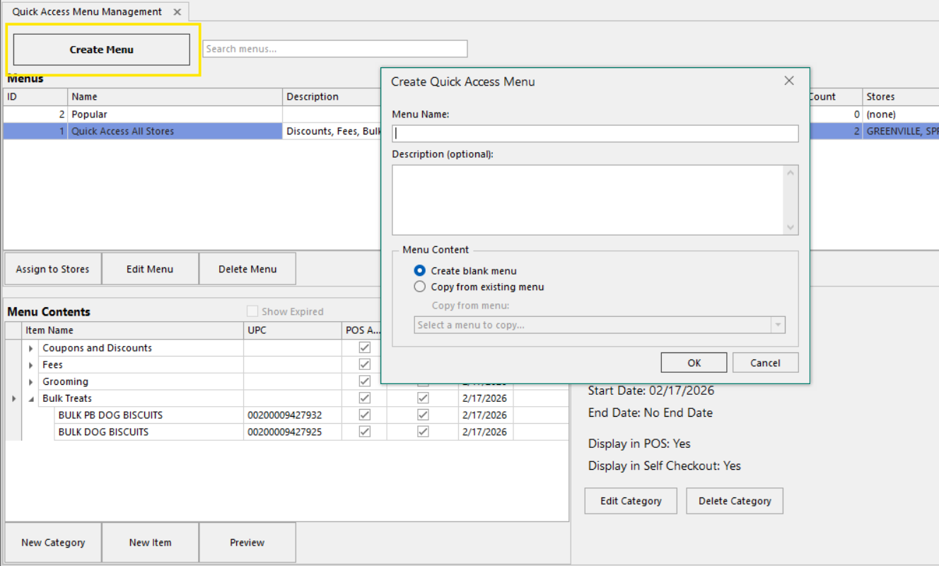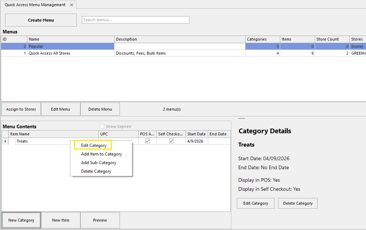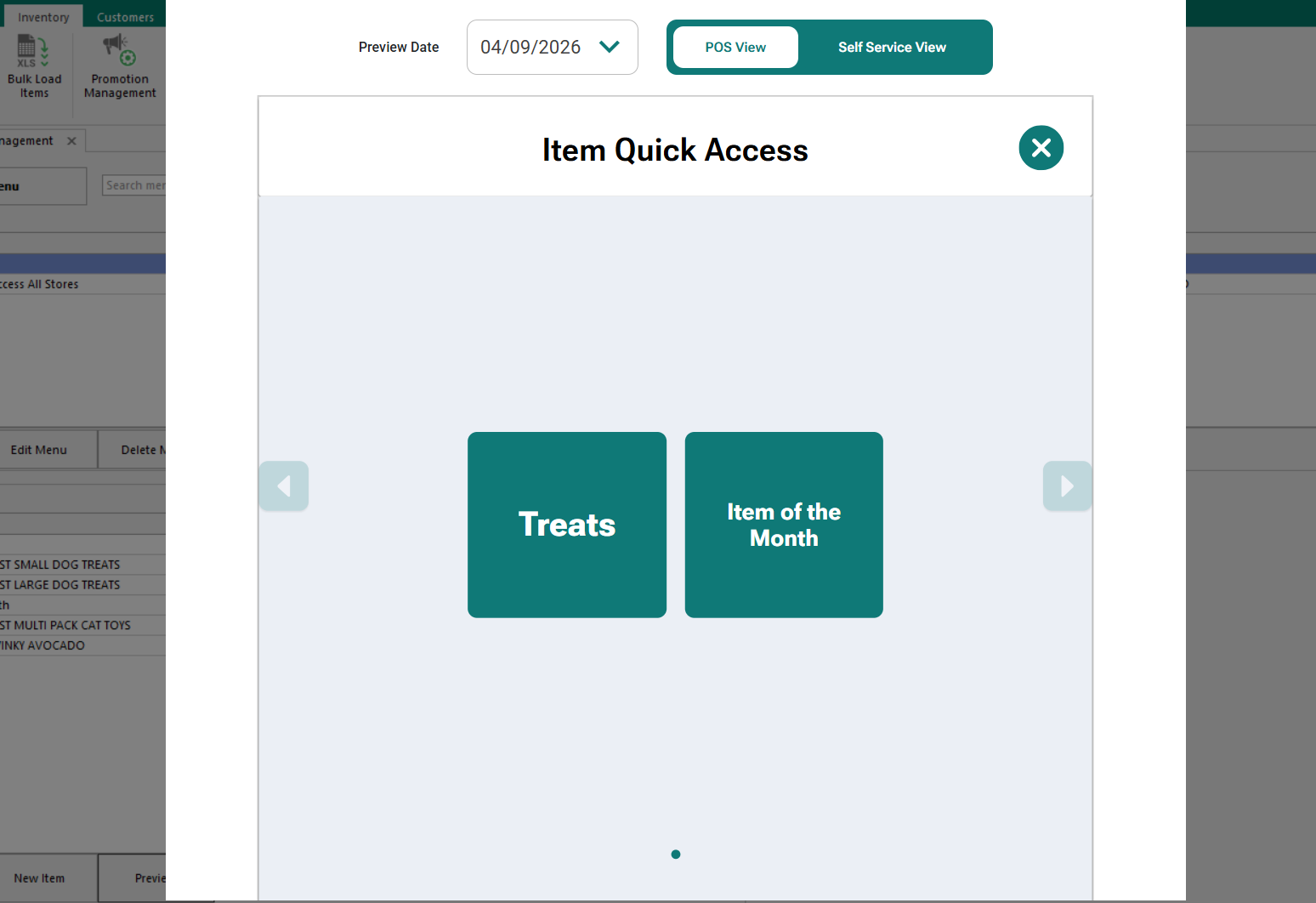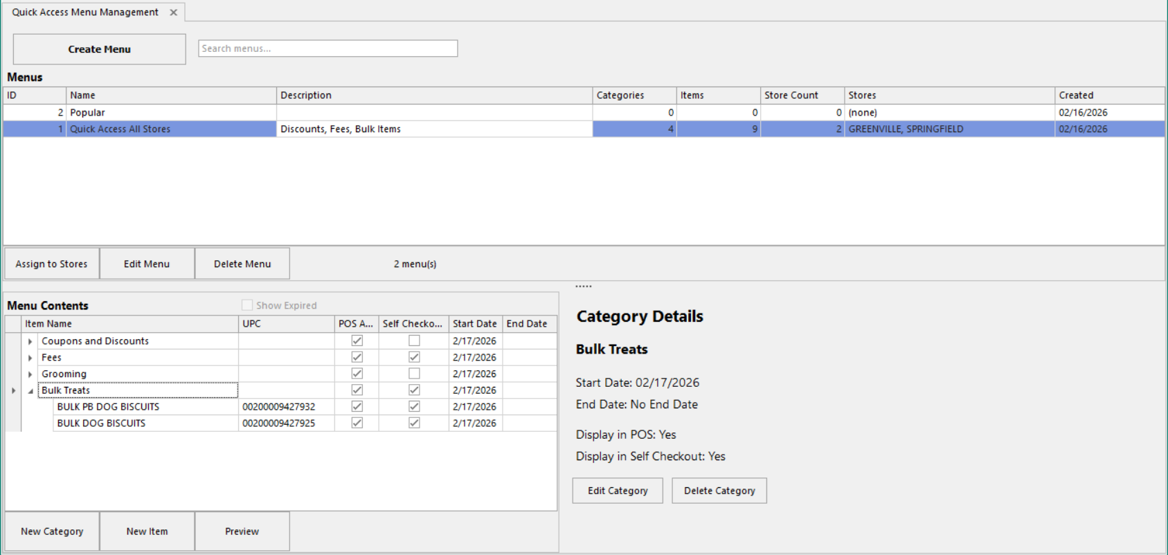 Quick Access Management lets you create and manage the Quick Access Menu that appears on POS registers and Self-Checkout kiosks. These menus give cashiers a quick way to add products to a sale without scanning. They are useful for large or heavy items, products without barcodes, coupons, or common fees like bag fees.