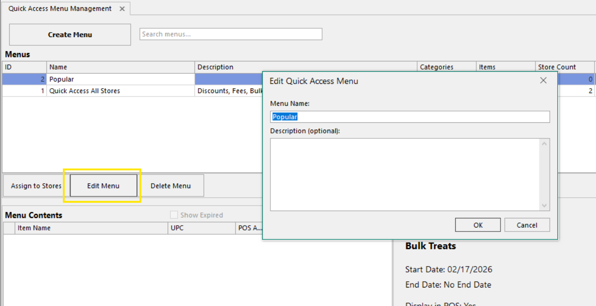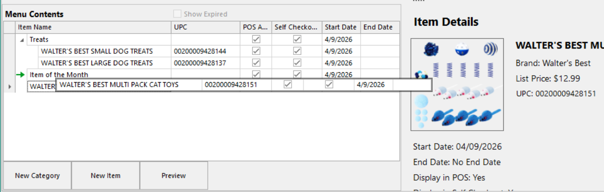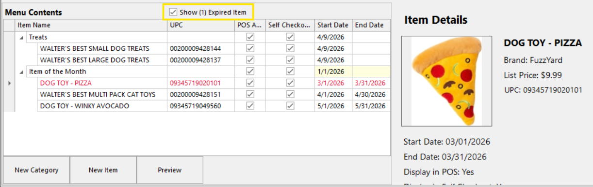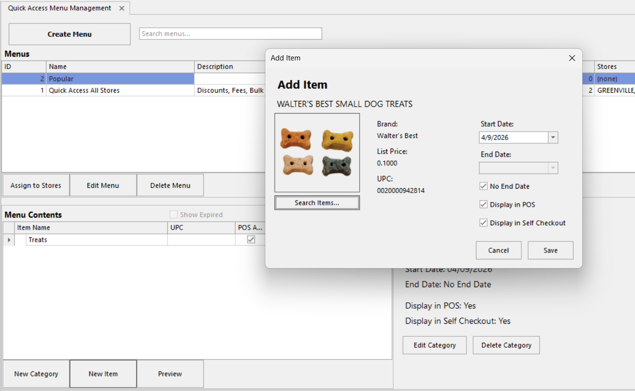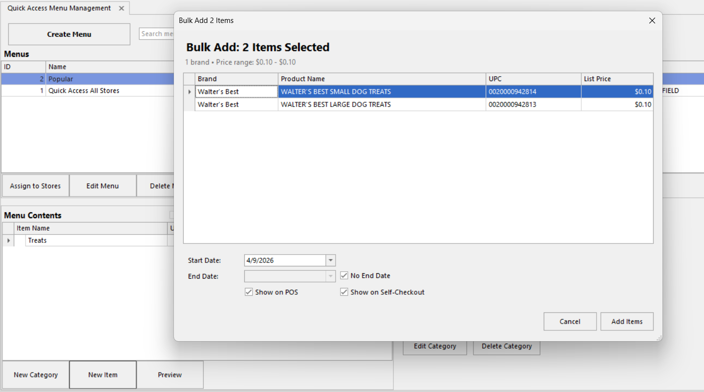 Items can be added with a future Start Date to schedule them in advance. When an item expires, it automatically disappears from the POS QAM, no manual removal is needed.