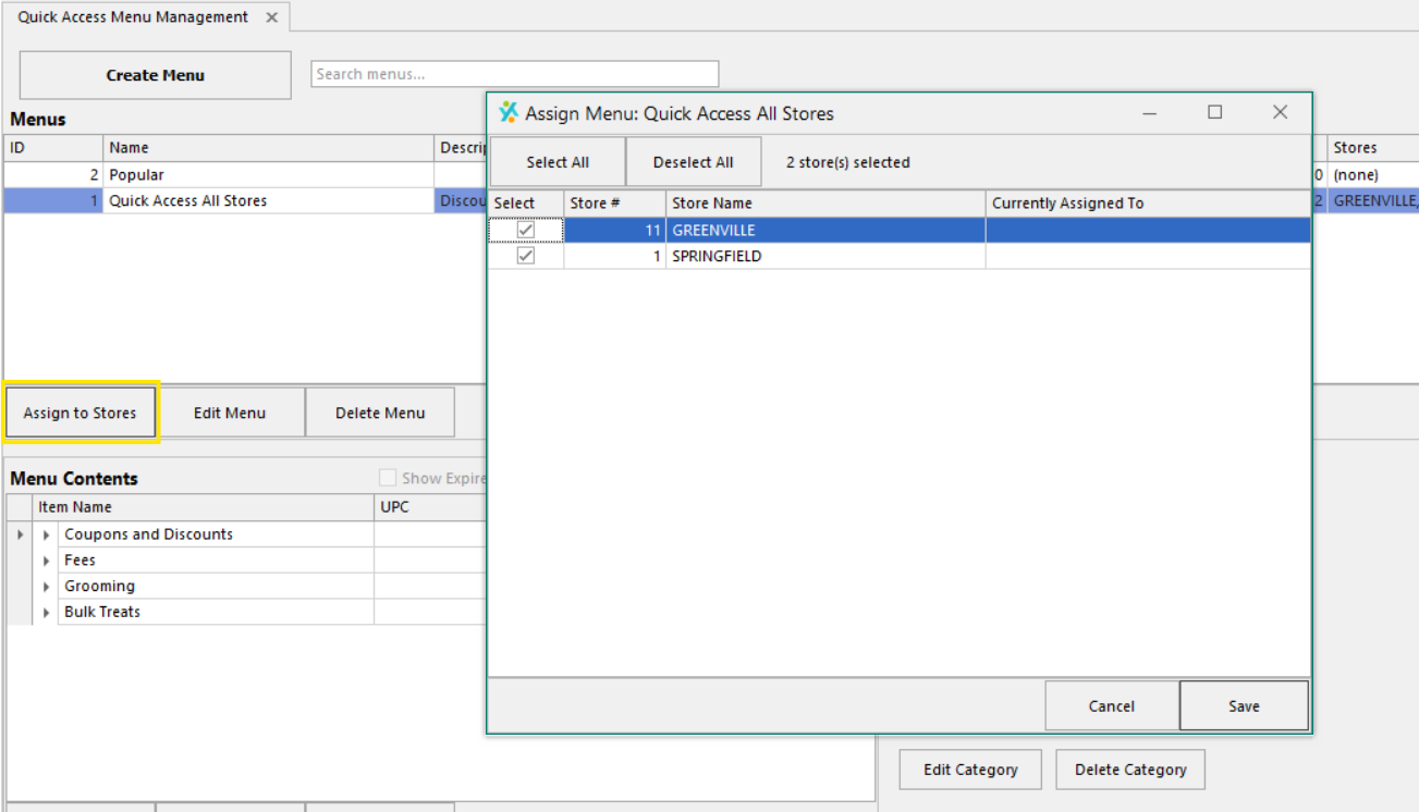 Select a menu and click Assign to Stores to open the store assignment screen. This shows all stores with checkboxes.
