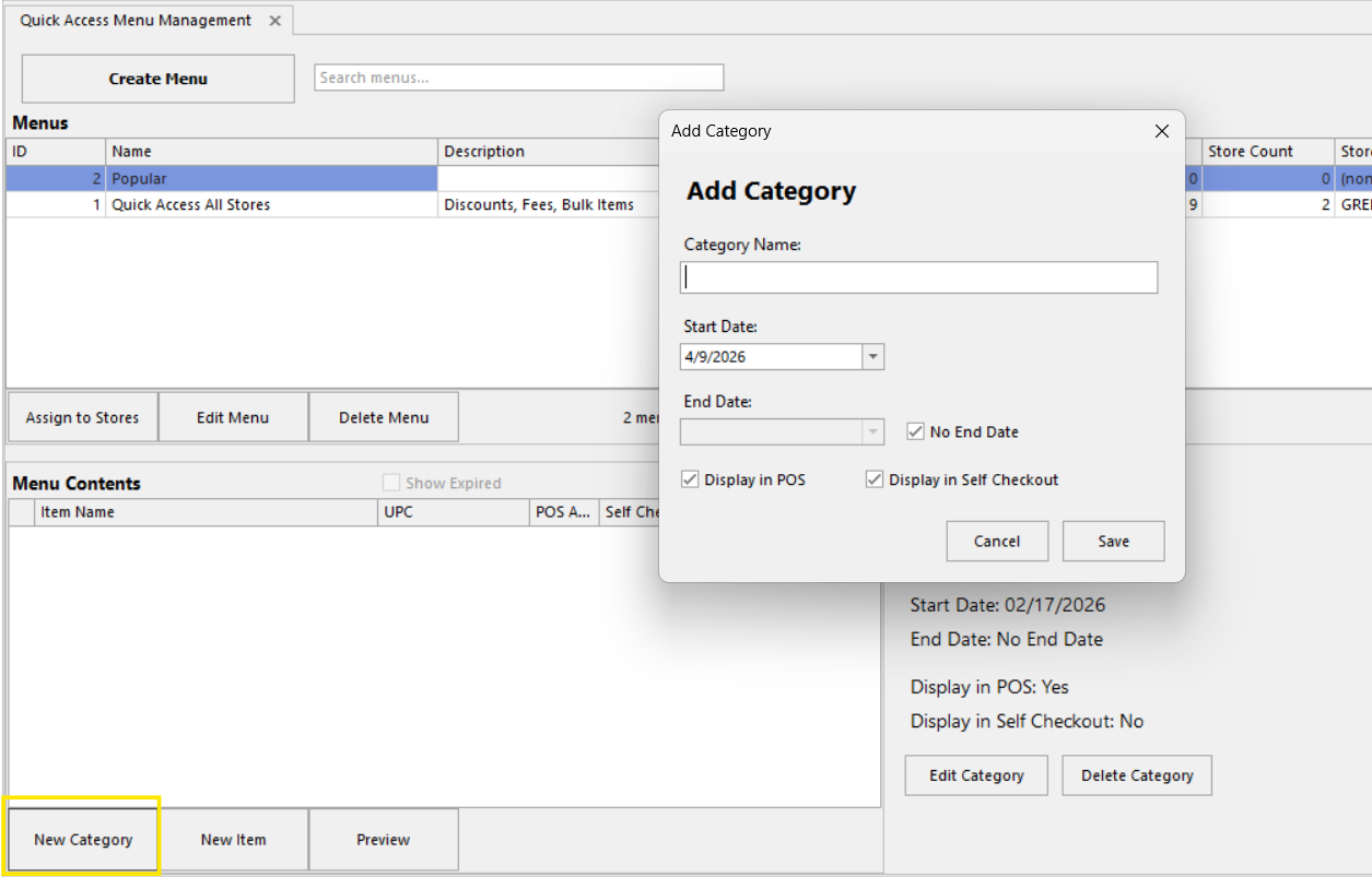 Every item and category has a Start Date and an optional End Date that control when it is visible on the QAM on the POS.