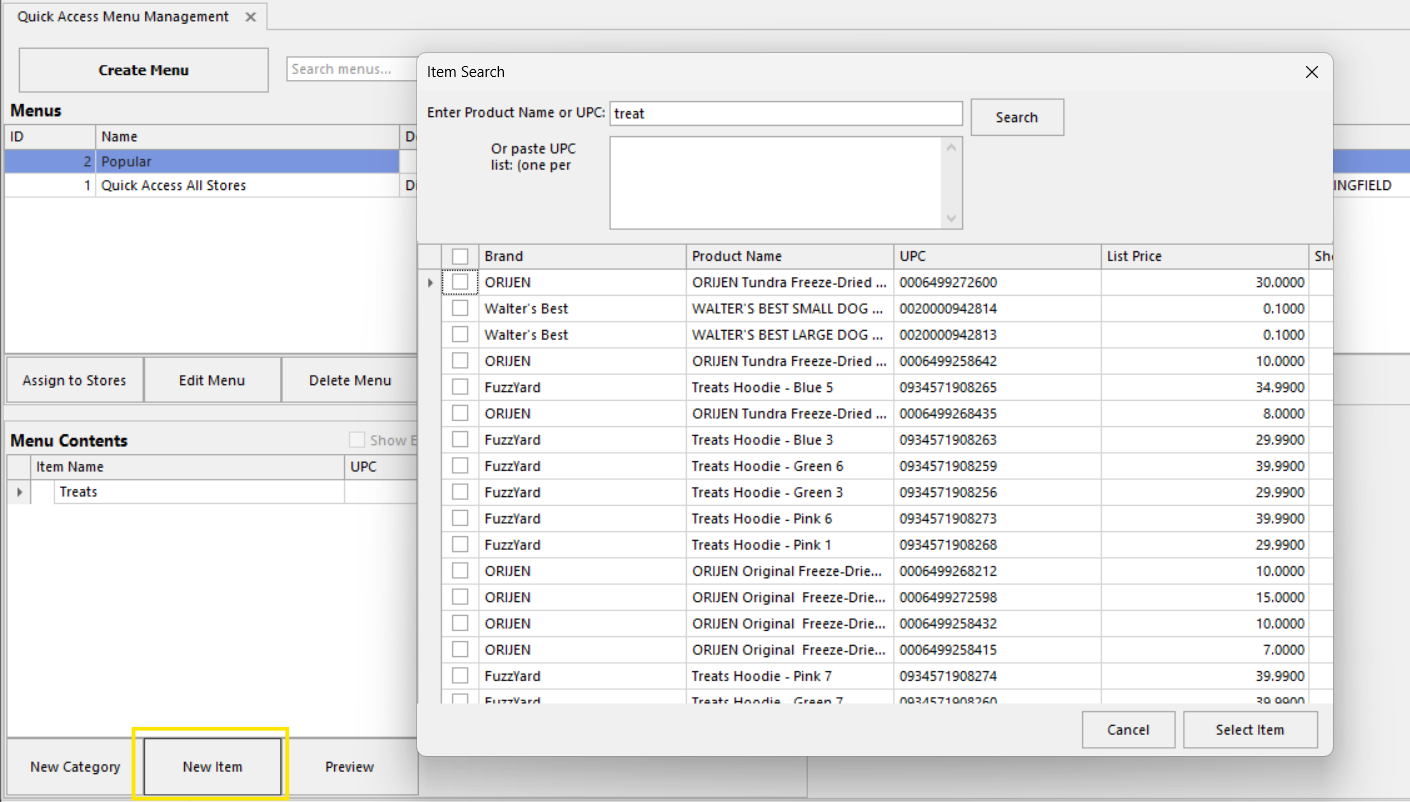 Click New Item in the tree panel. An item search popup opens where you can search by UPC or product name.