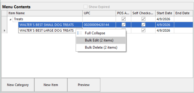 Menu Contents: When you select a menu from the list, the bottom panel displays its contents as a tree view. Categories appear as parent nodes, with their items nested underneath. The tree shows each entry's display name, UPC, start date, end date, POS visibility, Self-Checkout visibility, and sort order.