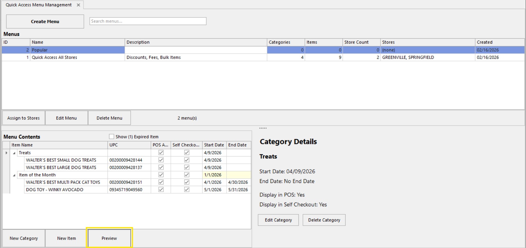 Select a menu and click Preview in the Menu Contents panel to see how the menu will look on the register. The preview shows the same grid and category navigation that will be on the POS and Self Checkout kiosks, filtered to only show items that are currently active.