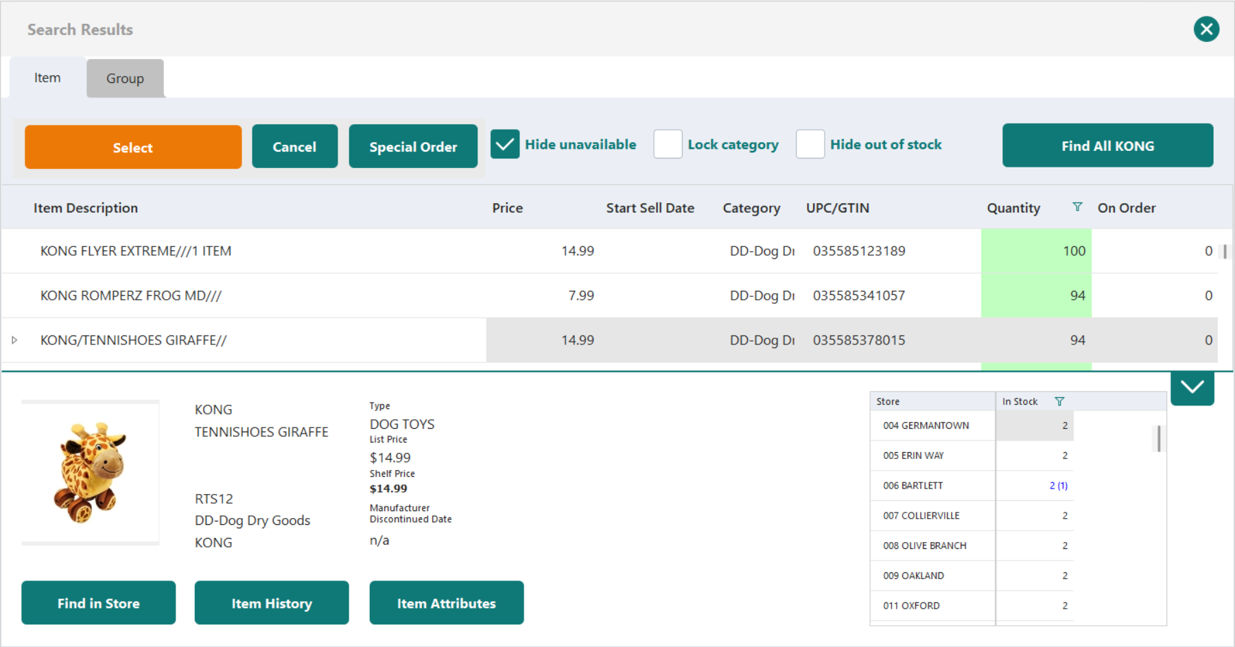 After searching, a window will open with the items found. The items are listed in the top part of the window. The details of the currently selected item, like the price and the stock in stores, are in the bottom part of the window.