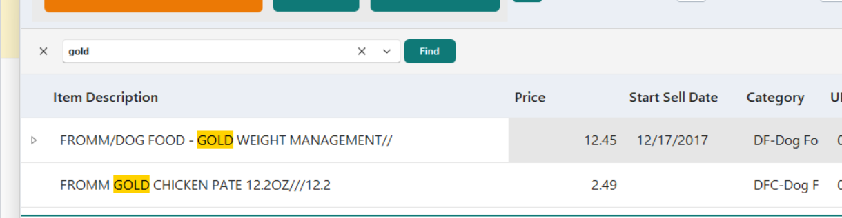 You can search for an item in the POS by typing the item's name, description, or key words into the search field. Press {ENTER} to search, and the results will be listed in most relevant order.