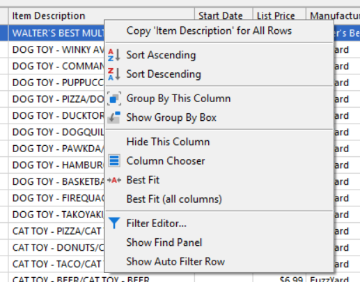 - Show Auto Filter Row - Adds filter row where you can type into any column to filter on that text