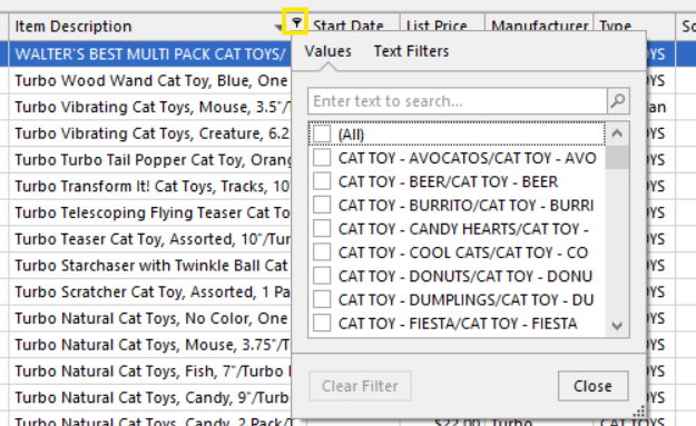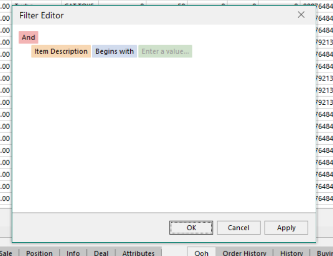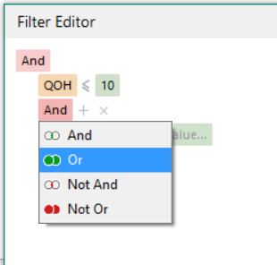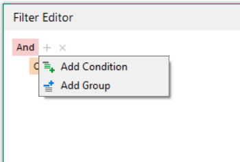 The Filter Editor (accessed by right-clicking on a column heading and selecting Filter Editor) may be used when you have several conditions by which to filter listings. By default, the heading on which you click choose the Filter Editor will appear as the first condition, but it can be changed.