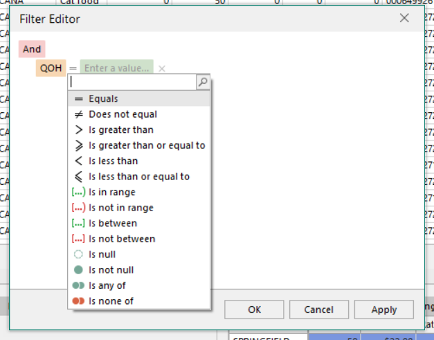 - Click on the Equals sign and select Is less than or equal to to indicate the quantity parameter, and then in the [enter a value] green space type in 10. Clicking Apply now will filter the results so that only items with 10 or fewer in stock will appear.