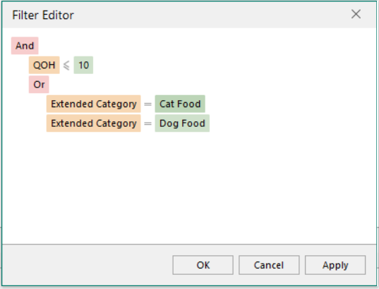 To view just Dog Food and Cat Food with this stock parameter, you need to add another grouping with two conditions.