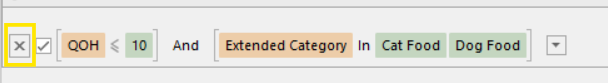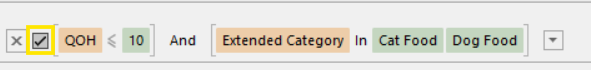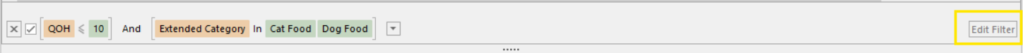 - For these two conditions under Or, click on the [QOH] and select Extended Category. Leave the Equals as is. In the [enter a value] fields, type "Cat Food" in one, and "Dog Food" in the other.