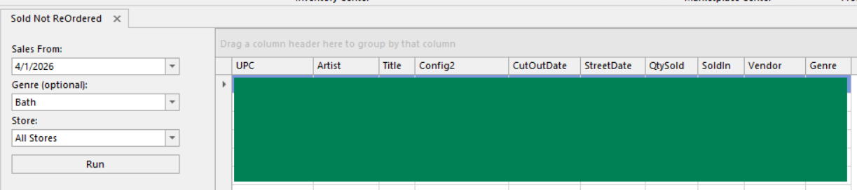 Shows items sold since a selected start date that have not been reordered, are currently out of stock at the store, and have no pending orders. Can be filtered by Primary Type and Store.