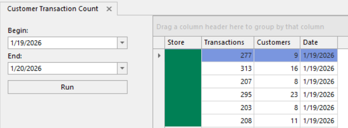 Shows the count of all transactions and customer transactions per day per store for a selected date range.