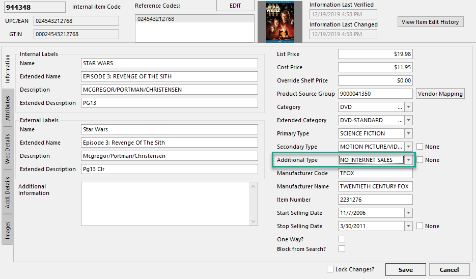 - No Internet Sales (IN1): Blocks the item from being listed on any internet platform - web store, Amazon, eBay, etc.