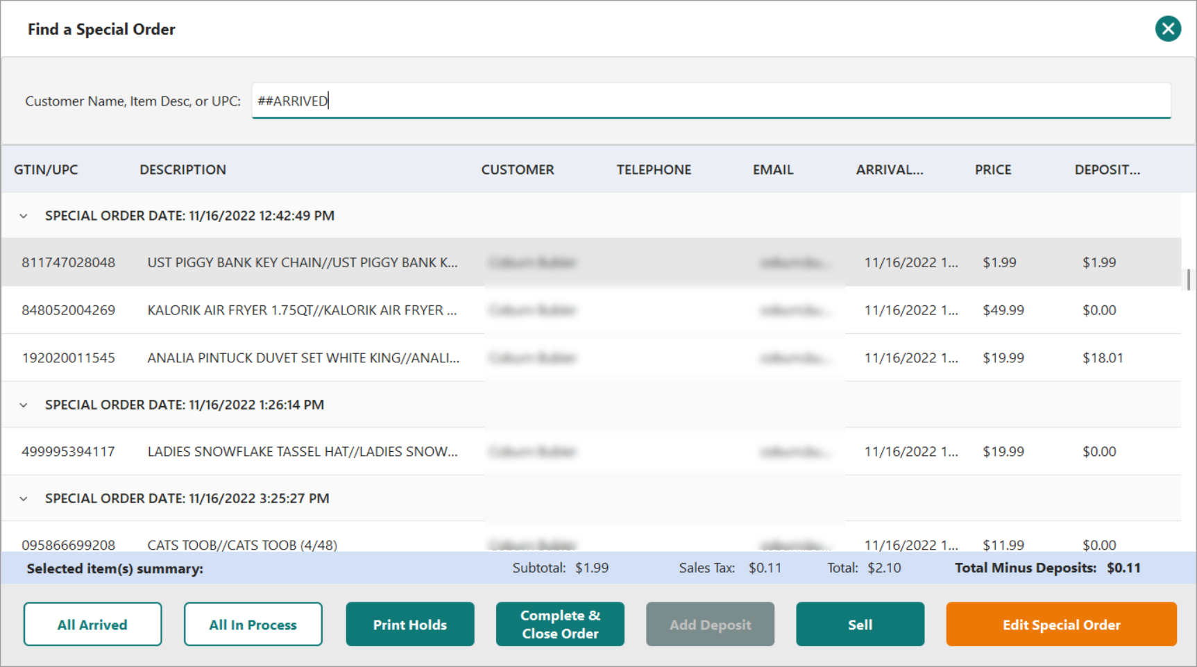 The Find Special Orders screen will display each item on a single line along with the customer’s name, email, and phone (if added), an arrival date if the item is already in the store, the price the customer will pay, as well as any deposit added to the item.